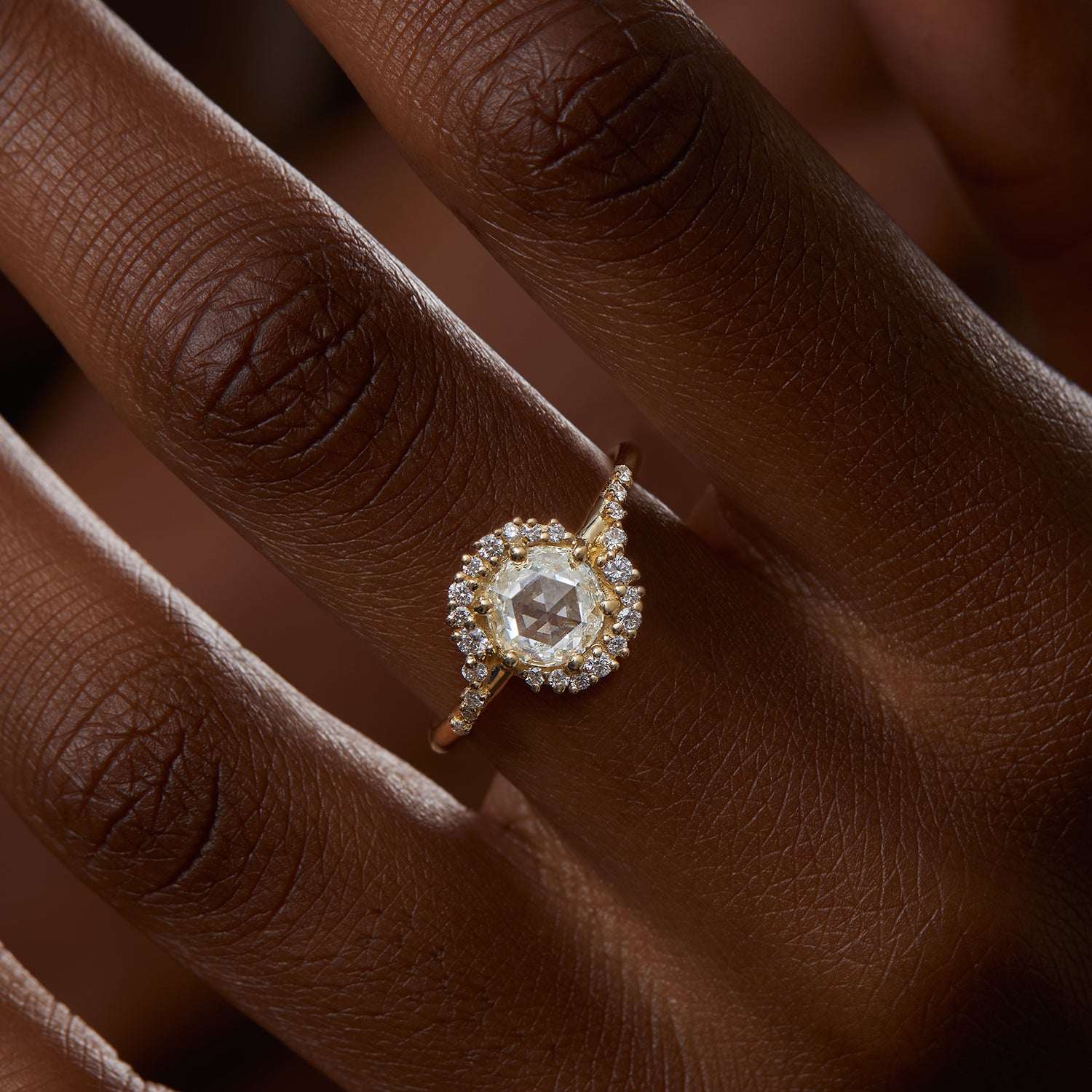 Our Isla ring is inspired by the enchanted fairy world, it features a center Rose-cut Moissanite, surrounded by a climbing natural diamonds trail.