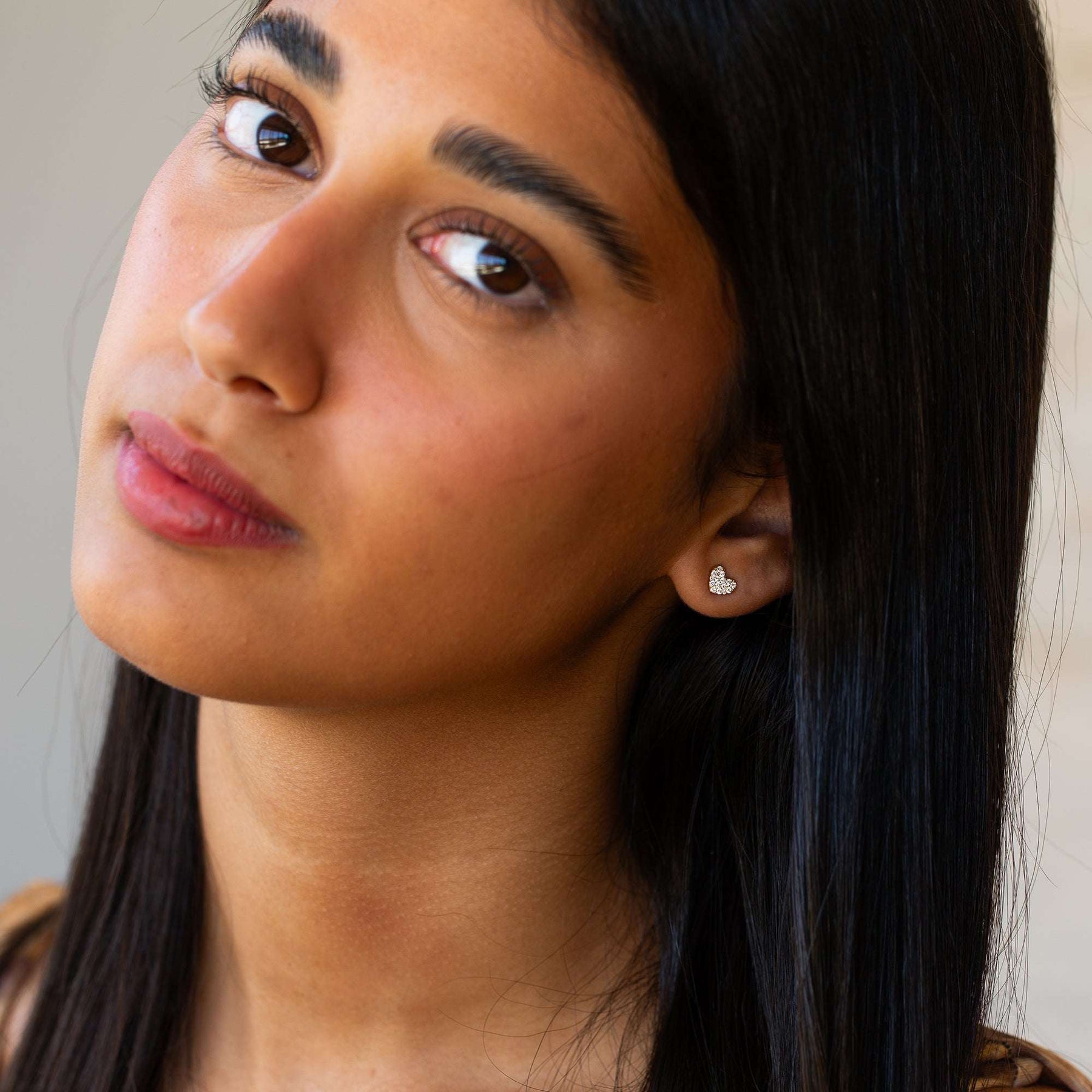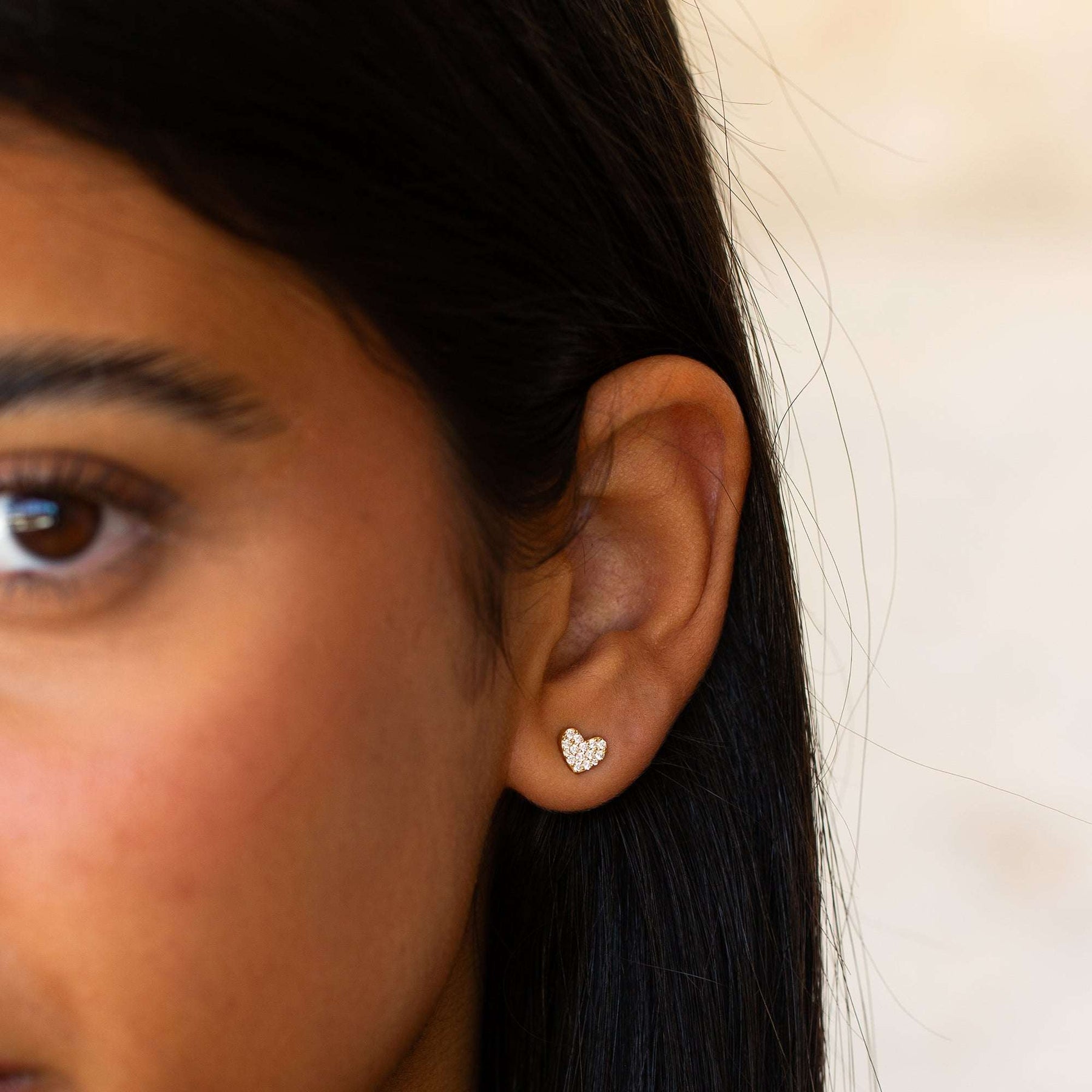 Close-up of a woman wearing heart stud earrings with a neutral background