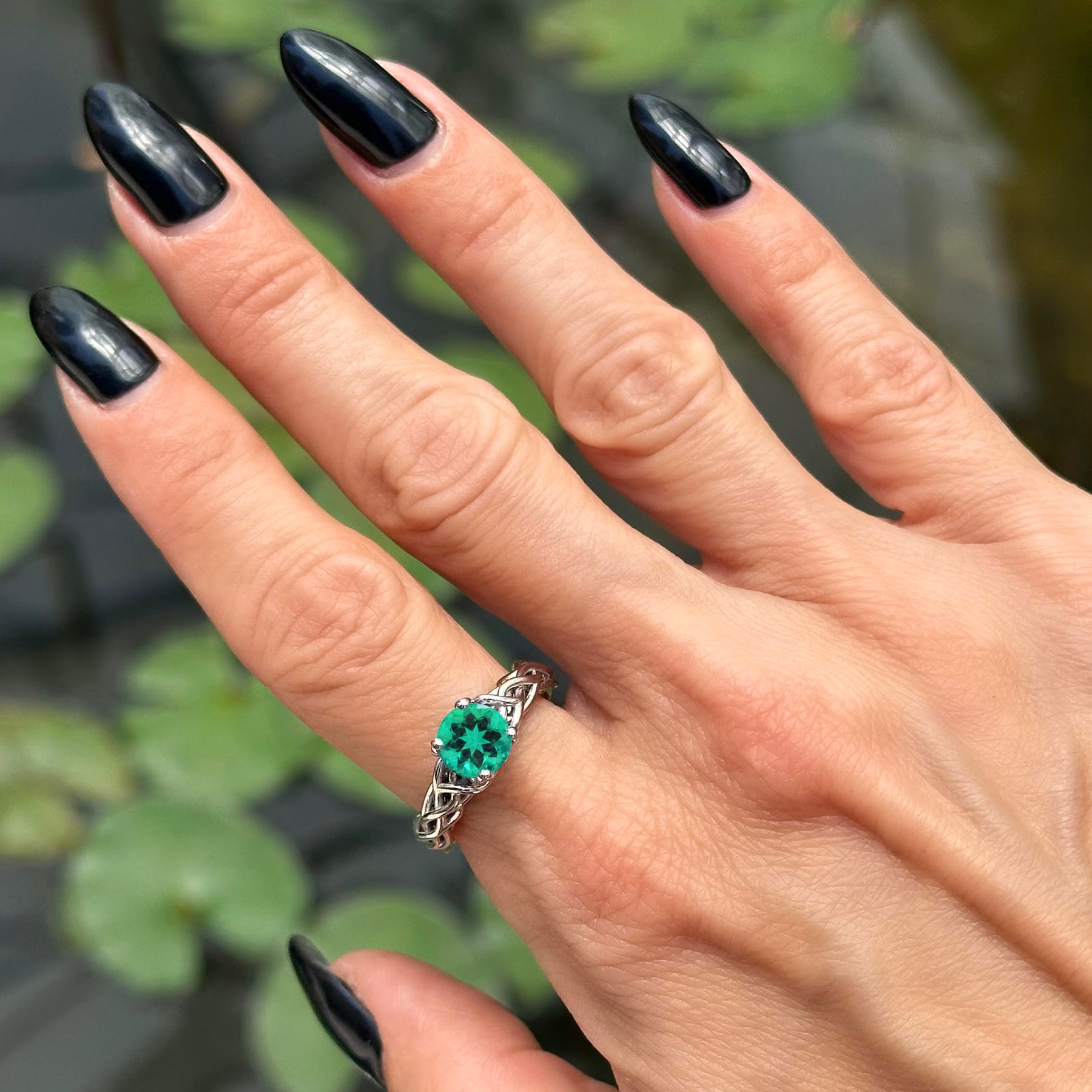 Hand with black nail polish wearing an emerald wedding ring with a green gemstone against a blurred natural background
