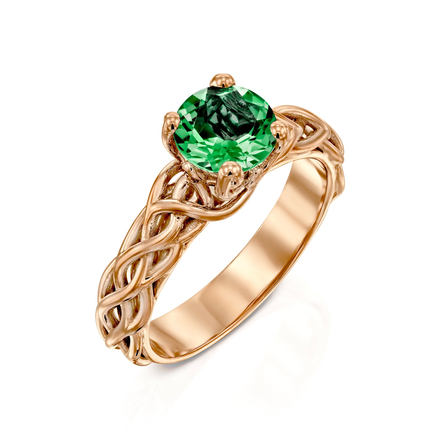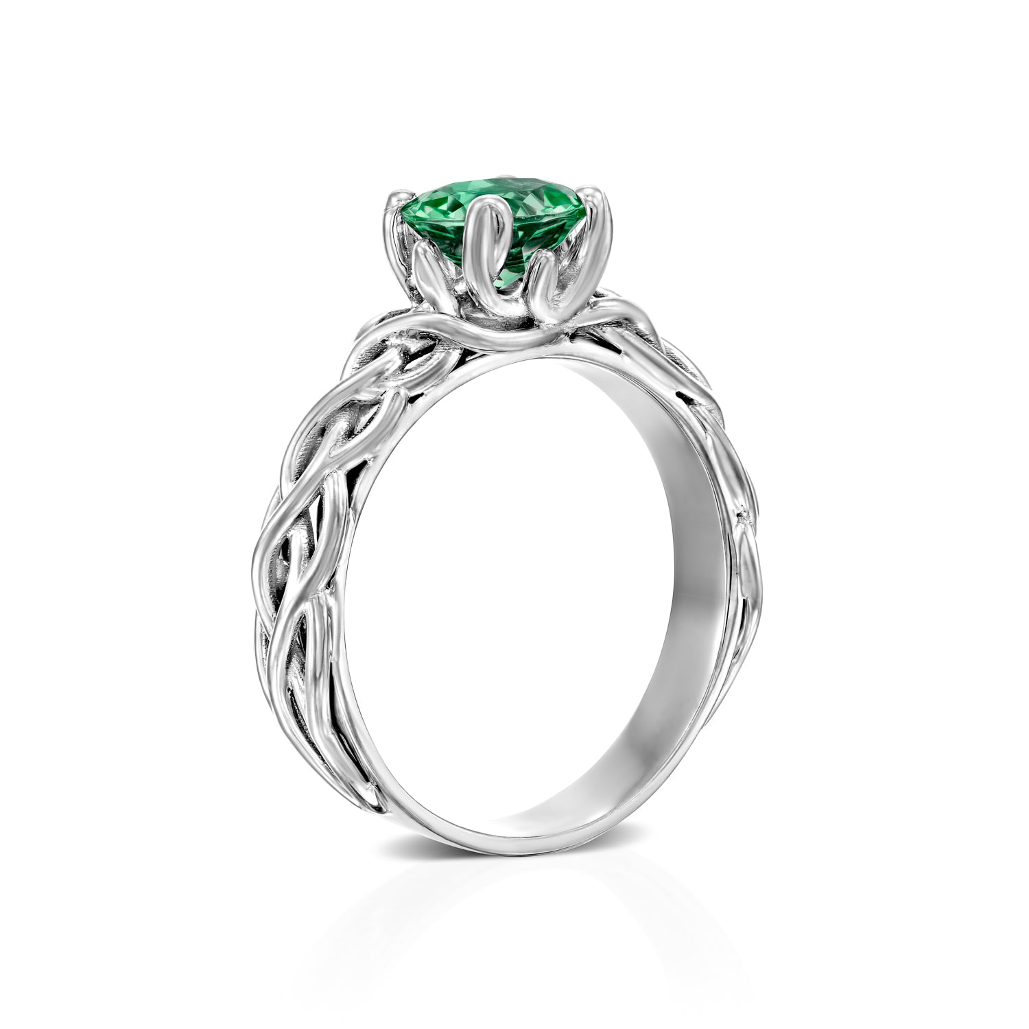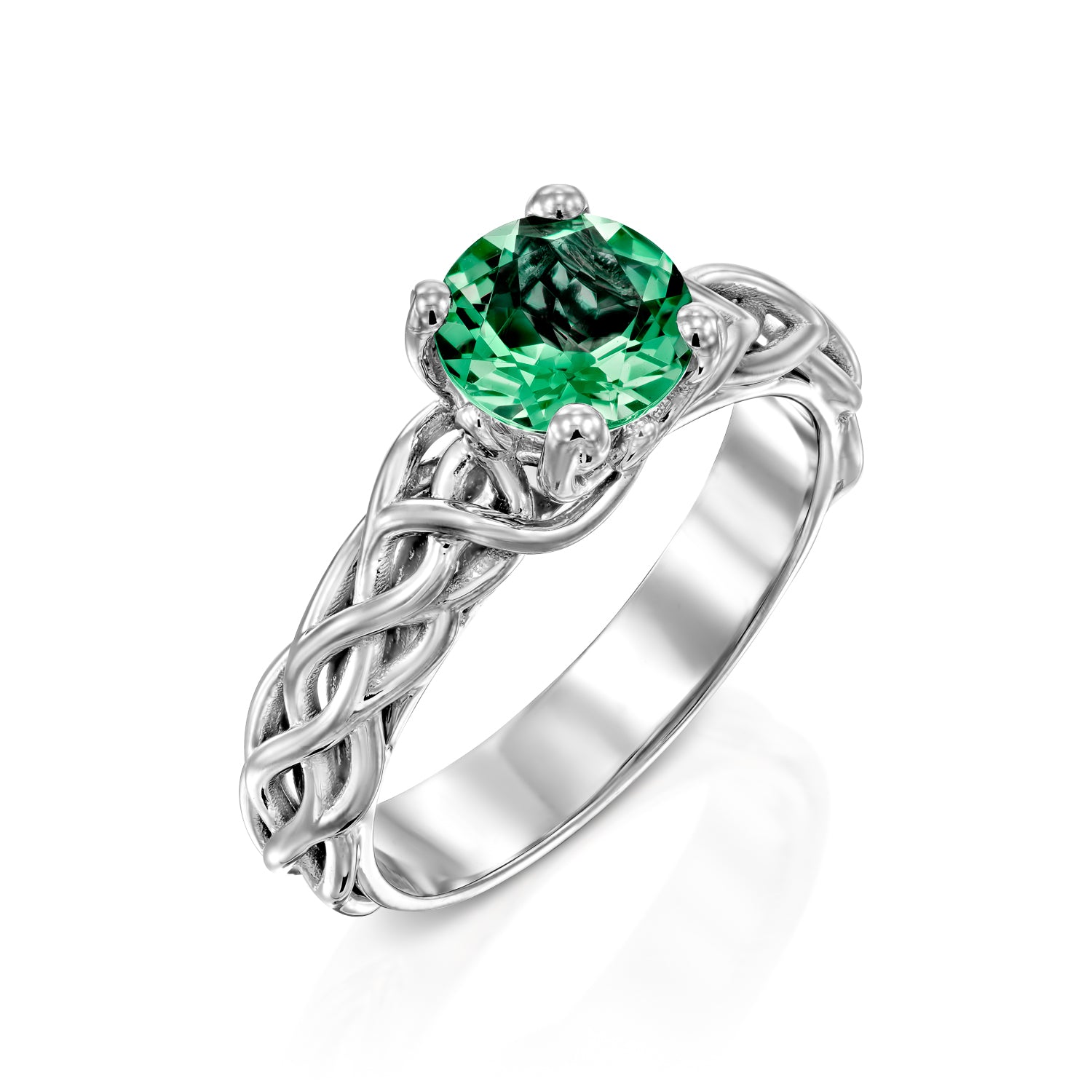 A symbol of love, heritage, and timeless beauty — this emerald engagement ring is crafted with a round cut green emerald at its heart, set in an intricate Celtic-inspired design. The rich green tones of the emerald glow with depth and vitality, making this not only a stunning green engagement ring but also a meaningful choice for those born in May, celebrated as the May birthstone ring.