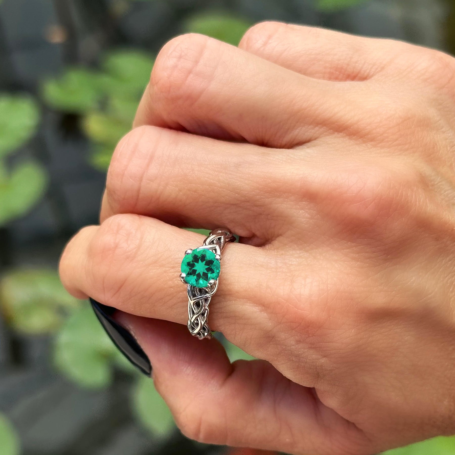 Hand wearing a celtic engagement ring with a green gemstone against a blurred natural background