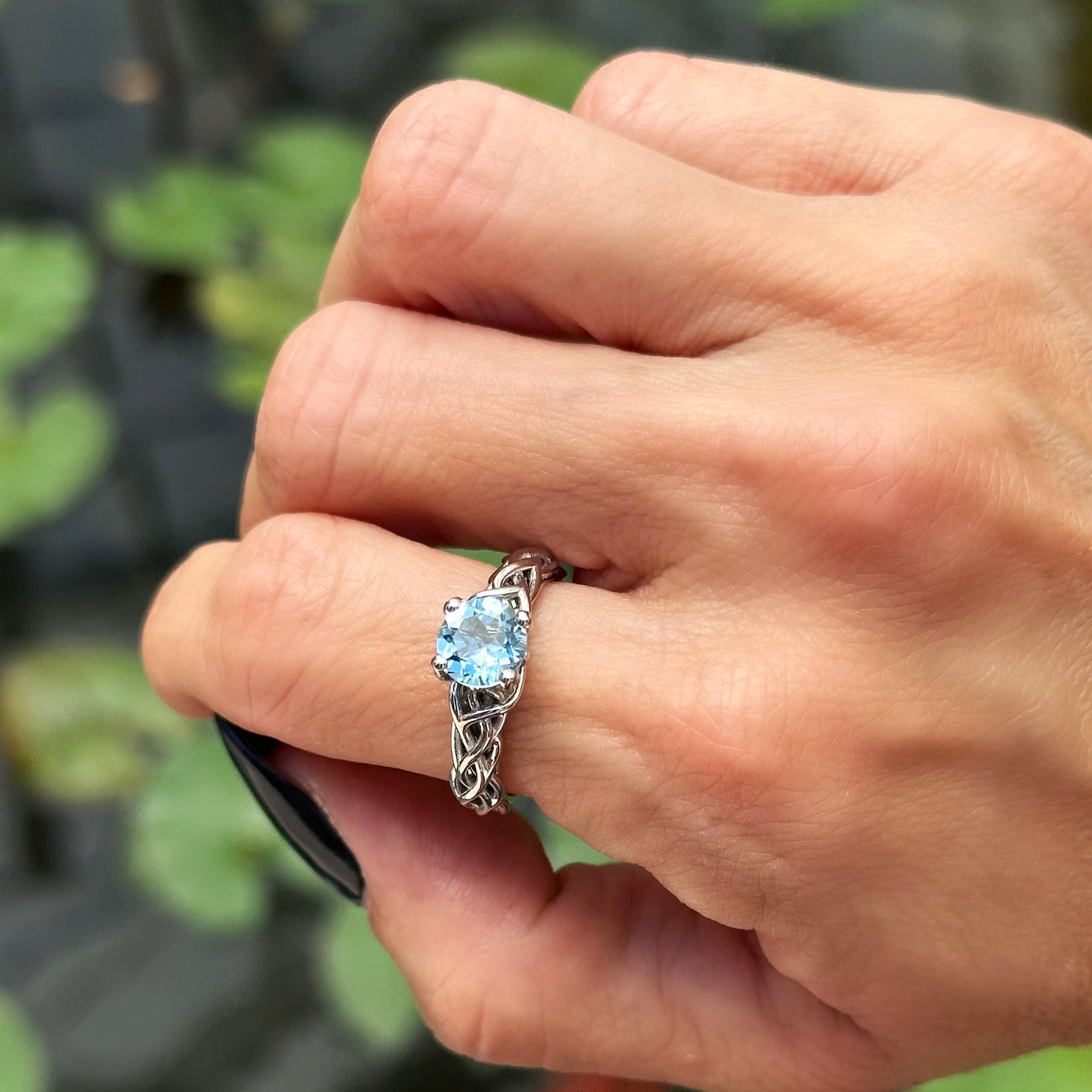 Hand with black nail polish wearing an aquamarine gold ring against a blurred green background