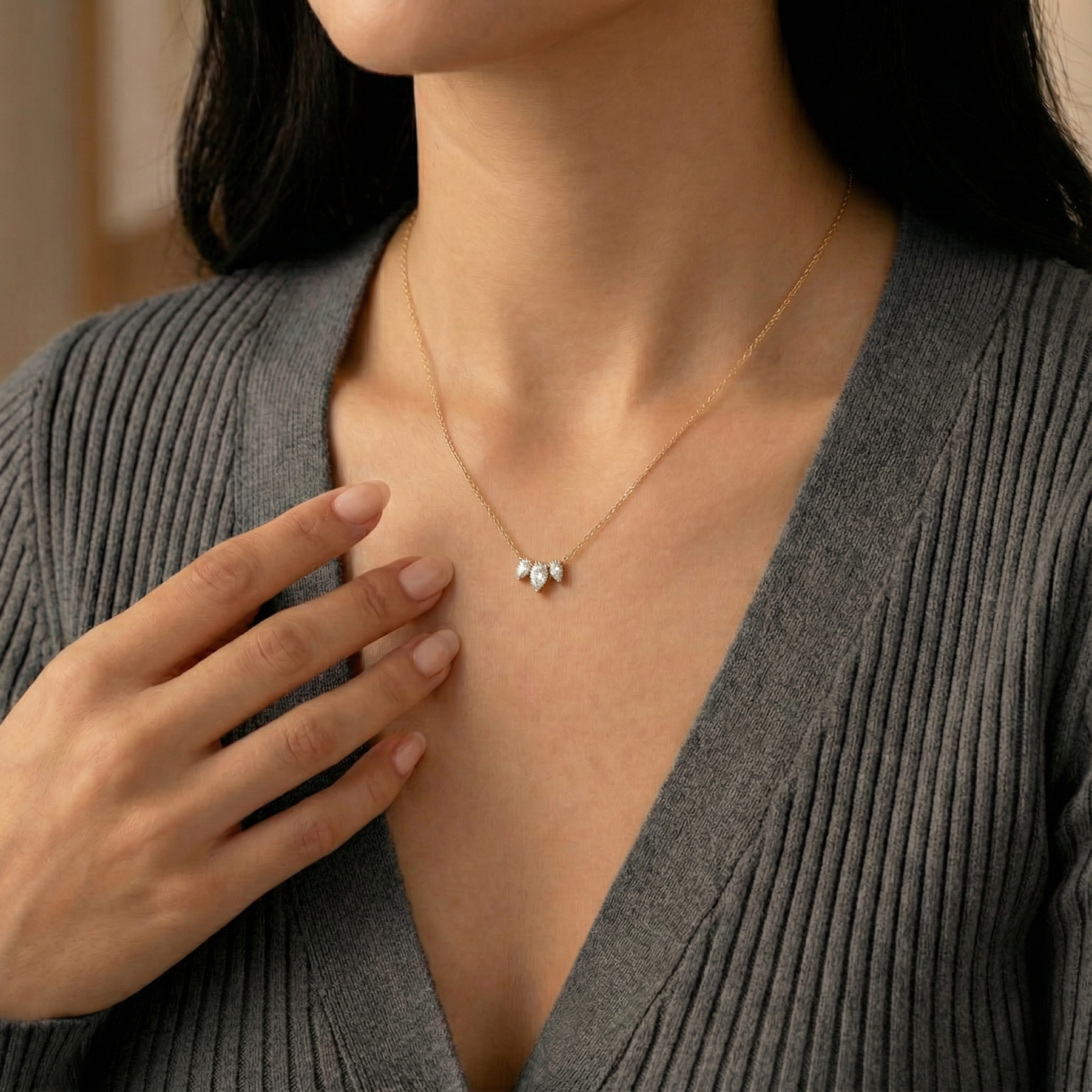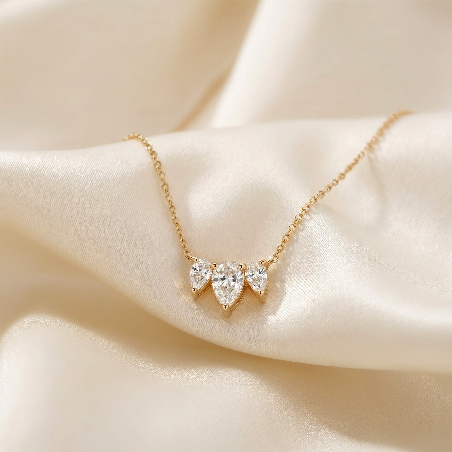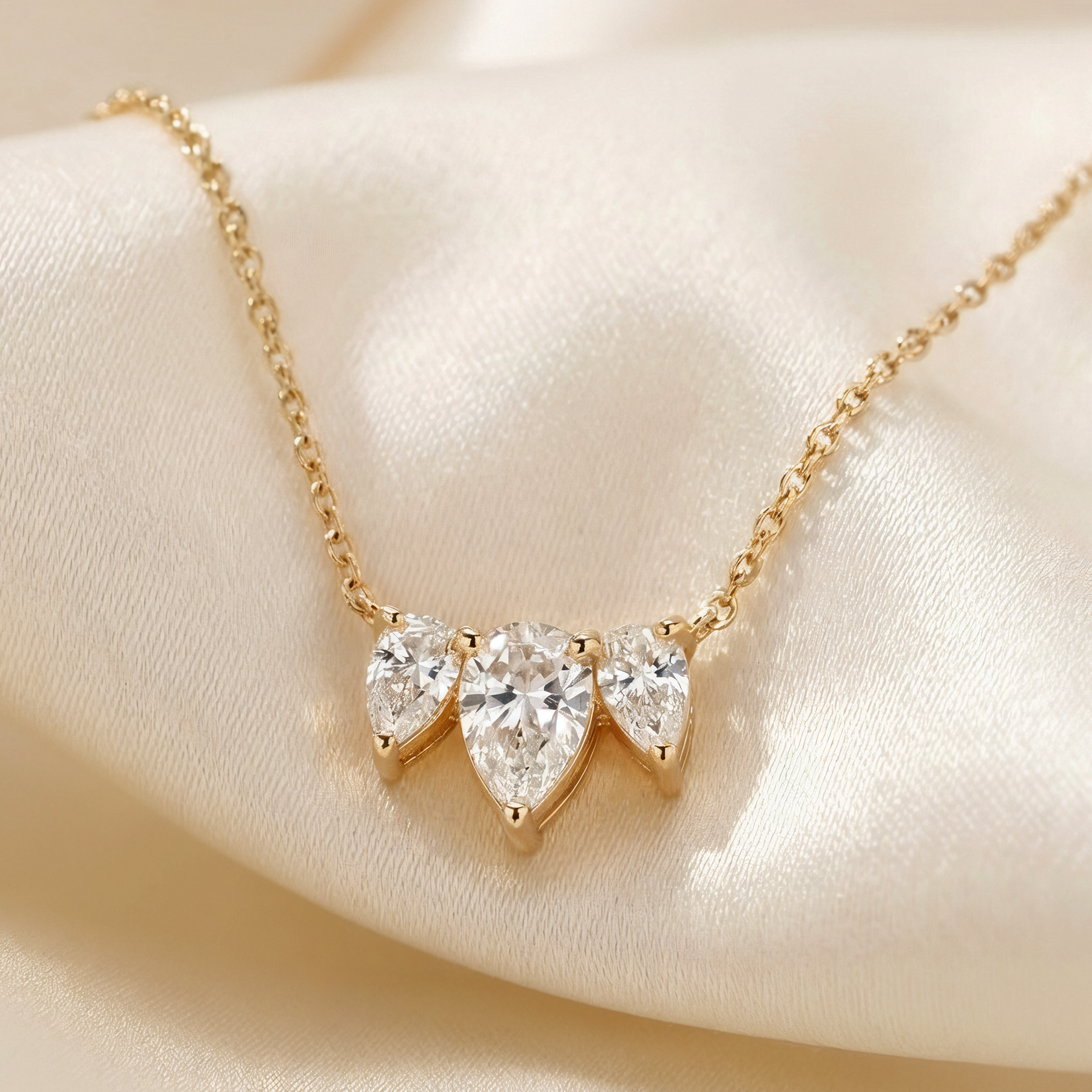A dainty and elegant 0.85CT diamond necklace, showcasing three sparkling pear-cut diamonds, beautifully set in 14K gold.
