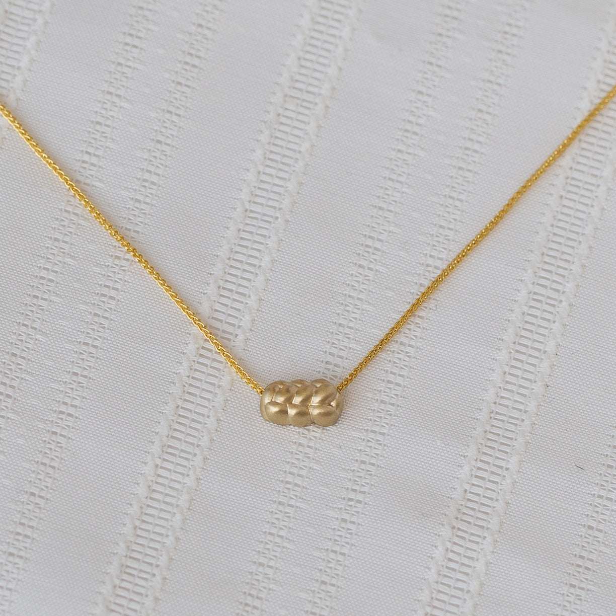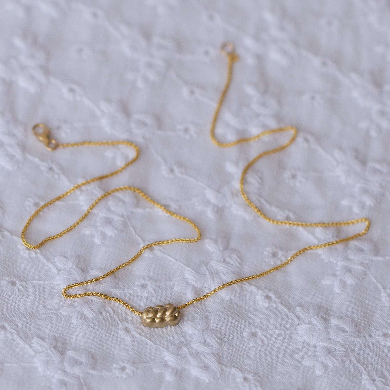 closeup of a 14K yellow Gold knot Necklace, with a challah pendant and dainty chain