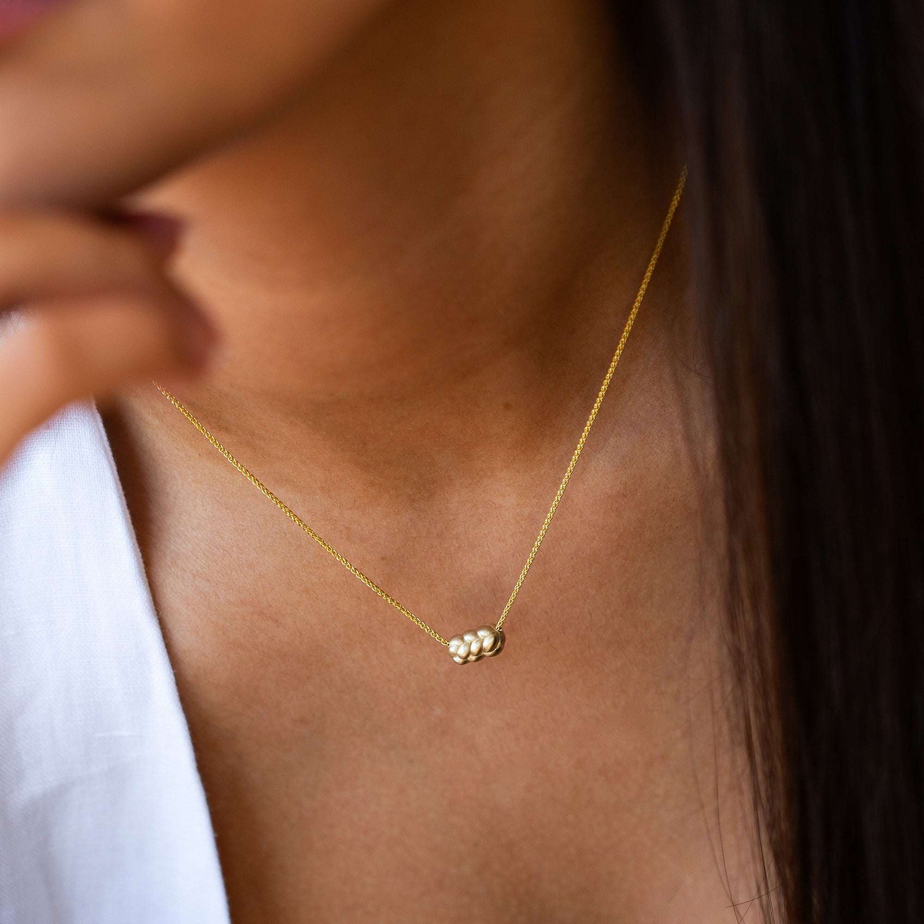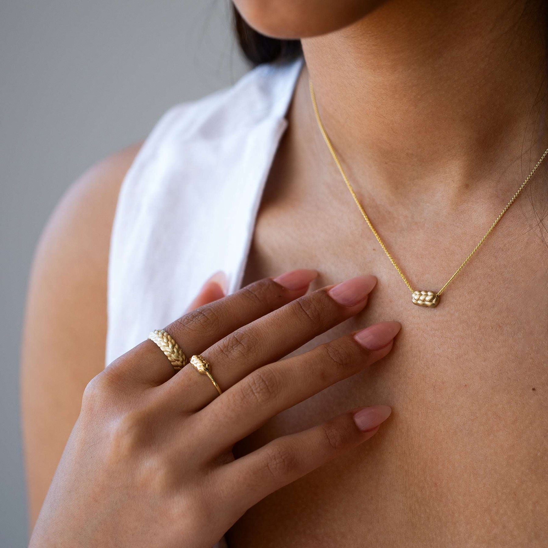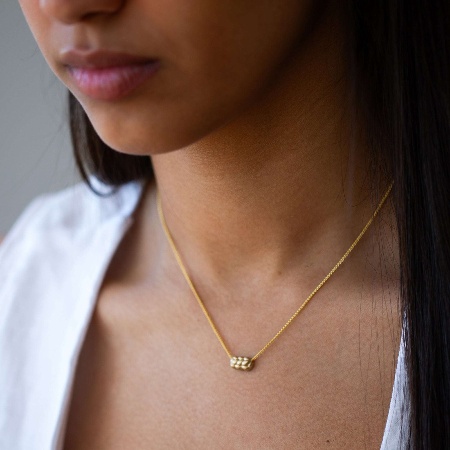 women wearing a 14K Gold knot Necklace, with a challah pendant and dainty chain