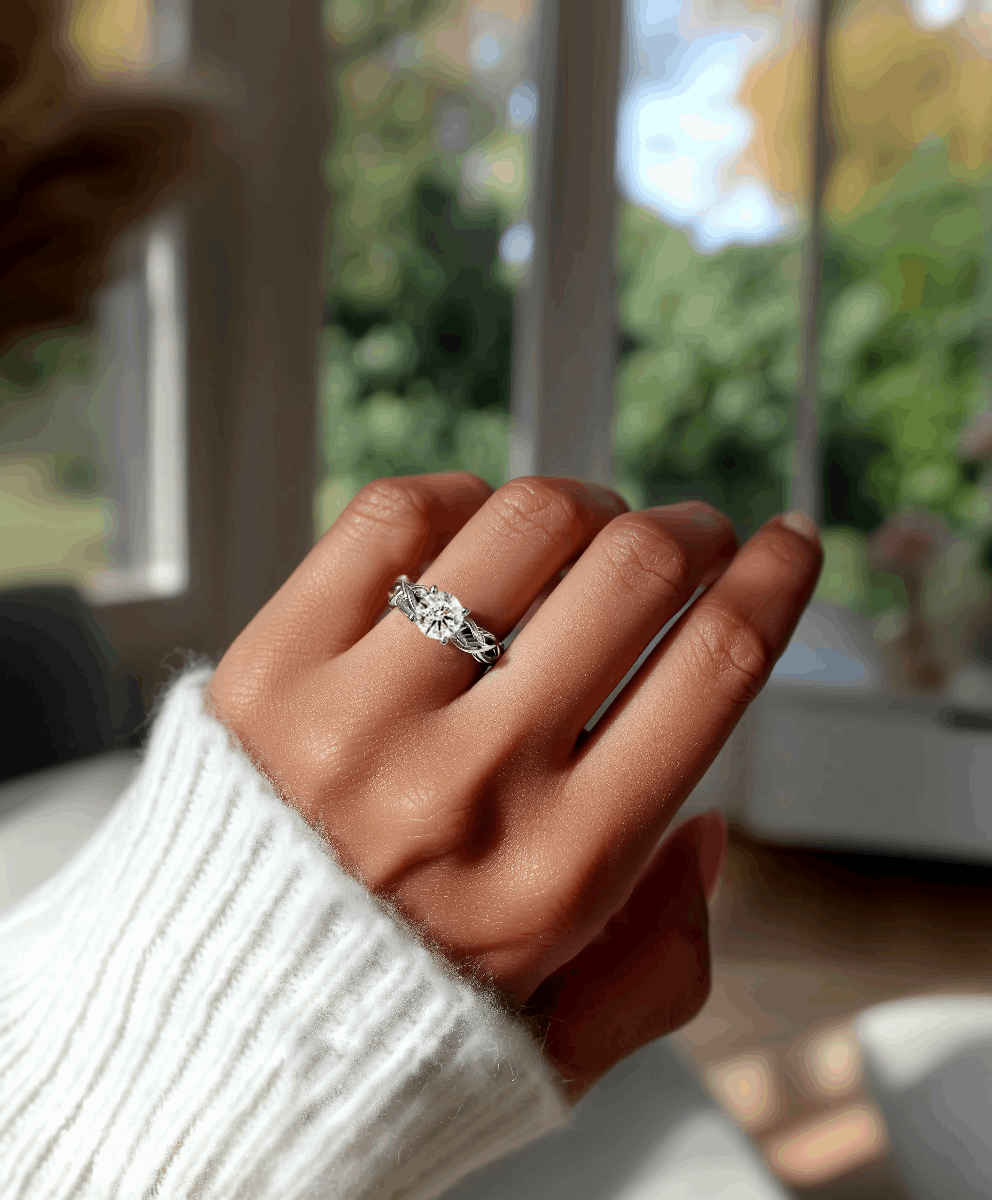 Close-up of a hand wearing a diamond vine ring with a blurred background