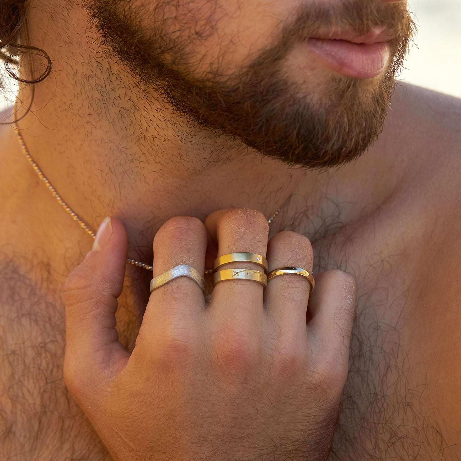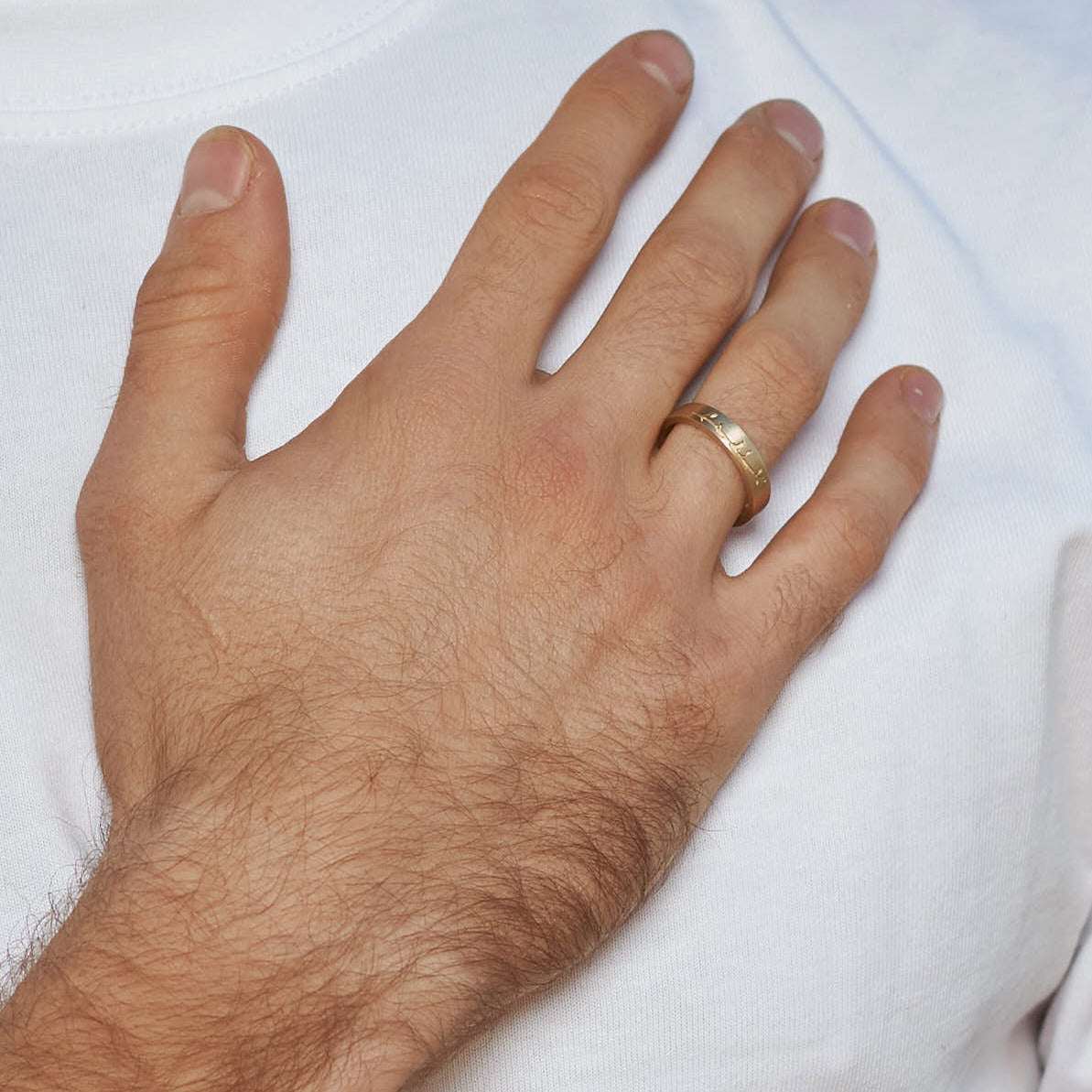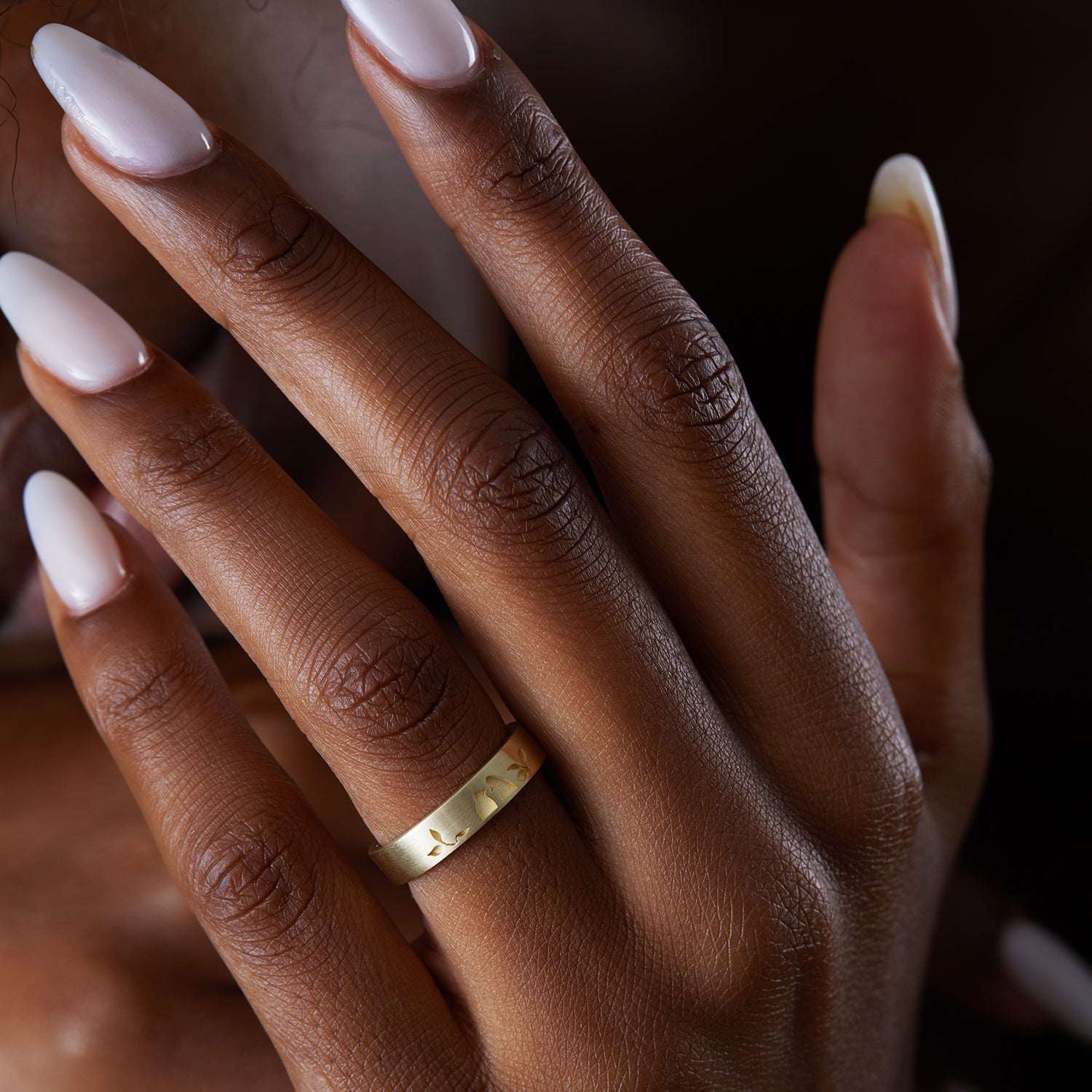 His & Hers matching 14K/18K solid gold bands in a silky matte finish with a unique love birds engraving. Each ring holds half of the picture, and together they embody your love story.
