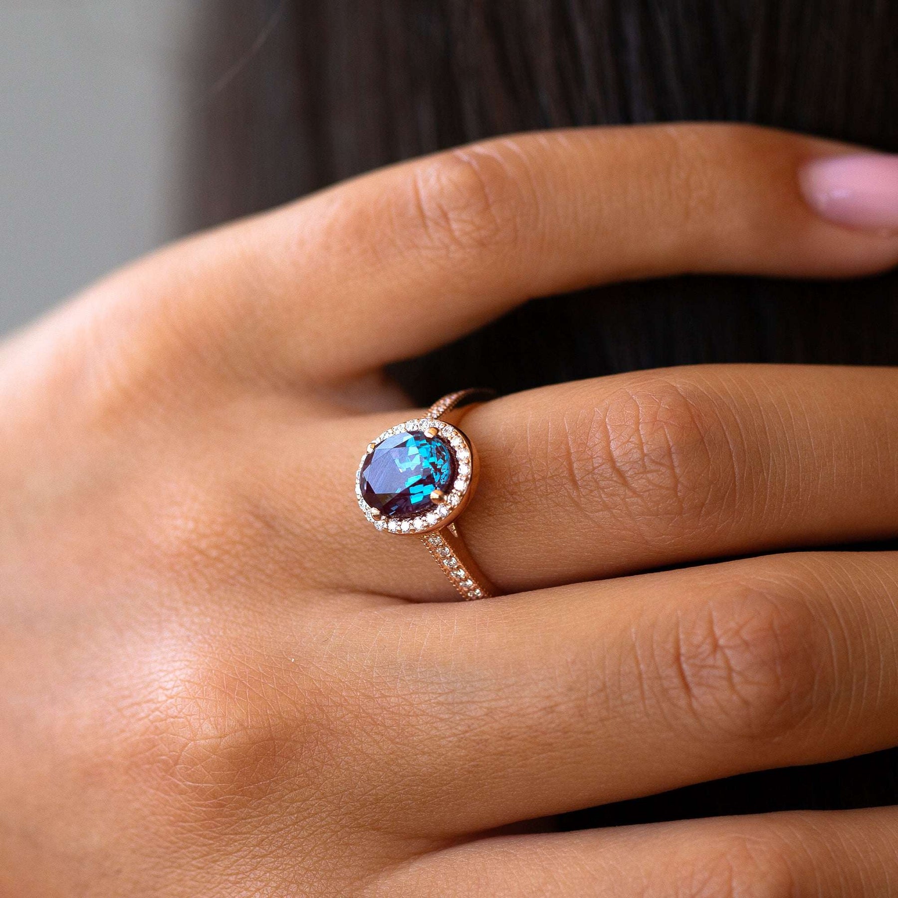 Close-up of a hand wearing an alexandrite engagement ring against a blurred background