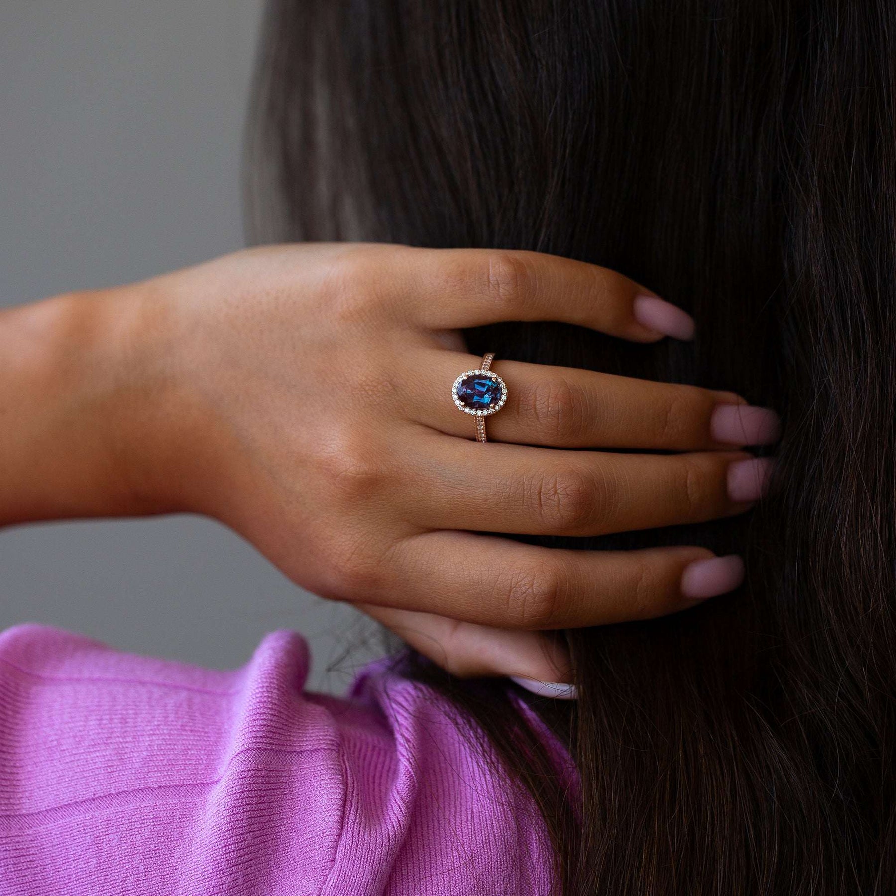 woman wearing an alexandrite engagement ring with a diamond halo in rose gold